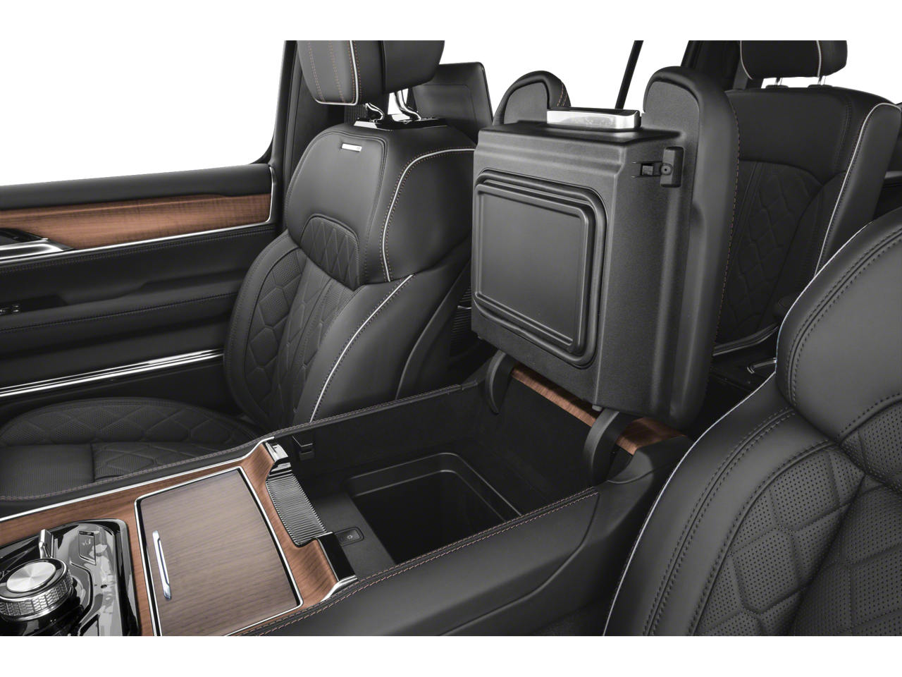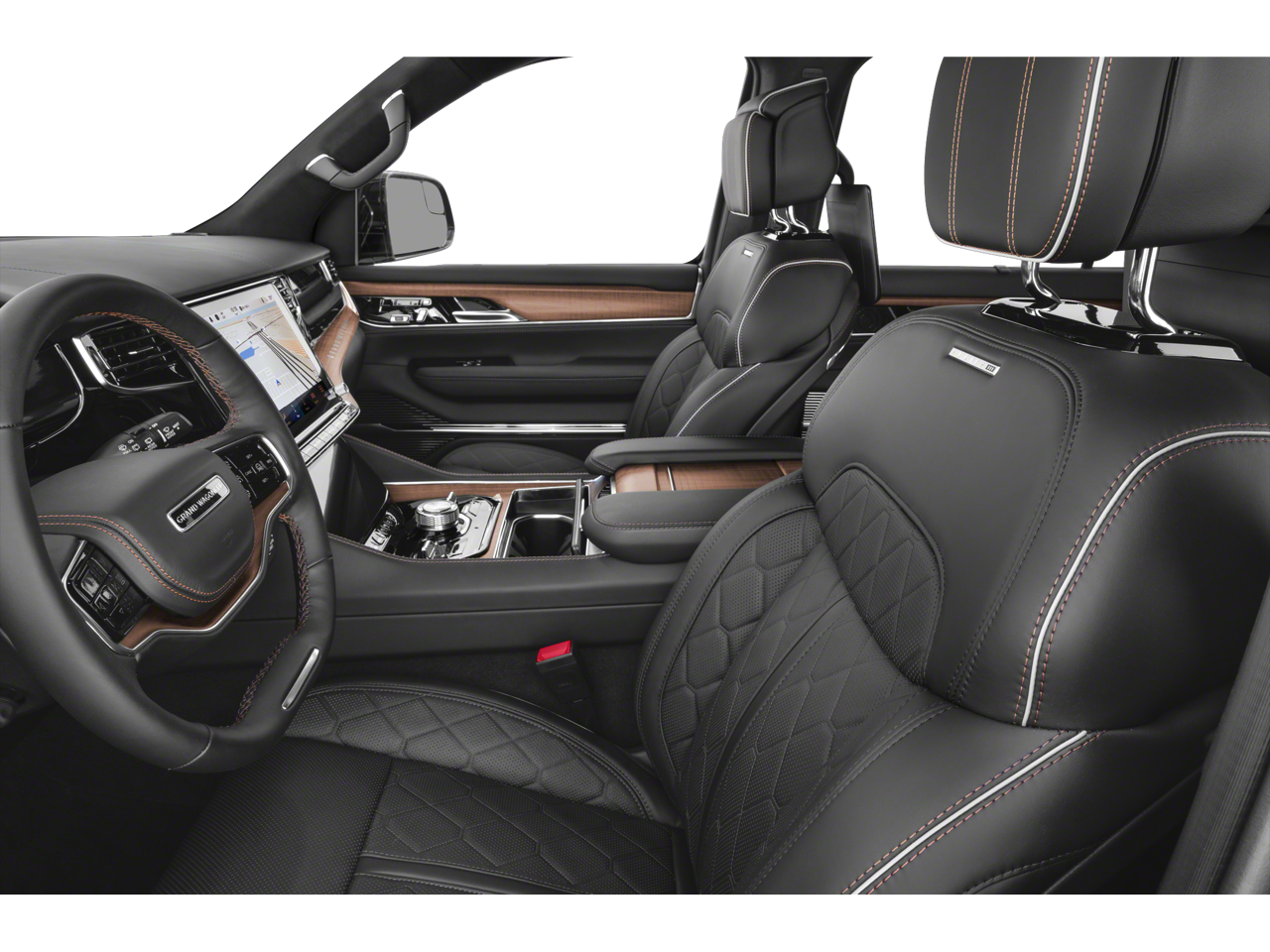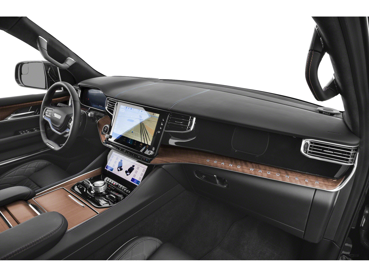 MOPAR Interior Protection Package (All-Season Floor Mats and Cargo Tray), Obsidian Appearance Package, Quick Order Package 28T Obsidian (Black Exterior Accents, Black Interior Accents, Black Roof, Gloss Black Upper & Lower DLO Molding, and Wheels: 22 x 9.0 Polished Painted Pockets), Rear Seat Video Group 1 (Amazon Fire TV Built-In, Seatback Video Screens, and Video USB Port), Two Tone Paint Group, 3.92 Rear Axle Ratio, 3rd row seats: bench, 4-Wheel Disc Brakes, ABS brakes, Adjustable pedals, Air Conditioning, Alloy wheels, AM/FM radio: SiriusXM with 360L, Anti-whiplash front head restraints, Apple CarPlay/Android Auto, Audio memory, Auto High-beam Headlights, Auto-dimming door mirrors, Auto-dimming Rear-View mirror, Auto-leveling suspension, Automatic temperature control, Body Color Roof w/2T, Brake assist, Bumpers: body-color, Compass, Delay-off headlights, Driver door bin, Driver vanity mirror, Driver's Seat Mounted Armrest, Dual front impact airbags, Dual front side impact airbags, Electronic Stability Control, Emergency communication system: Jeep Connect, Four wheel independent suspension, Front anti-roll bar, Front Bucket Seats, Front Center Armrest w/Storage, Front dual zone A/C, Front fog lights, Front reading lights, Fully automatic headlights, Garage door transmitter, Genuine wood console insert, Genuine wood dashboard insert, Genuine wood door panel insert, Heads-Up Display, Heated door mirrors, Heated front seats, Heated rear seats, Heated steering wheel, Illuminated entry, Knee airbag, Leather steering wheel, Low tire pressure warning, Memory seat, Navigation System, Night vision lights, Normal Duty Suspension, Occupant sensing airbag, Outside temperature display, Overhead airbag, Overhead console, Panic alarm, Passenger door bin, Passenger seat mounted armrest, Passenger vanity mirror, Pedal memory, Power adjustable front head restraints, Power door mirrors, Power driver seat, Power Liftgate, Power moonroof, Power passenger seat, Power steering, Power windows, Premium Leather Trimmed Bucket Seats, Radio data system, Radio: Uconnect 5 Nav w/12.0 Display, Rain sensing wipers, Rear air conditioning, Rear anti-roll bar, Rear dual zone A/C, Rear reading lights, Rear seat center armrest, Rear window defroster, Rear window wiper, Reclining 3rd row seat, Remote keyless entry, Roof rack, Security system, Speed control, Speed-sensing steering, Speed-Sensitive Wipers, Split folding rear seat, Steering wheel memory, Steering wheel mounted audio controls, Tachometer, Telescoping steering wheel, Tilt steering wheel, Traction control, Trip computer, Turn signal indicator mirrors, Variably intermittent wipers, Ventilated front seats, Ventilated rear seats, Voltmeter, and Wheels: 22 x 9.0 Painted Aluminum.