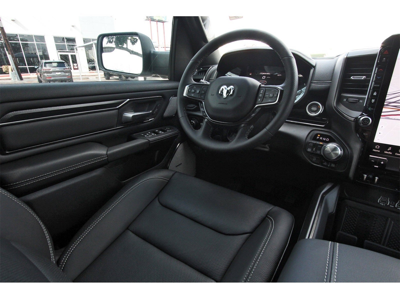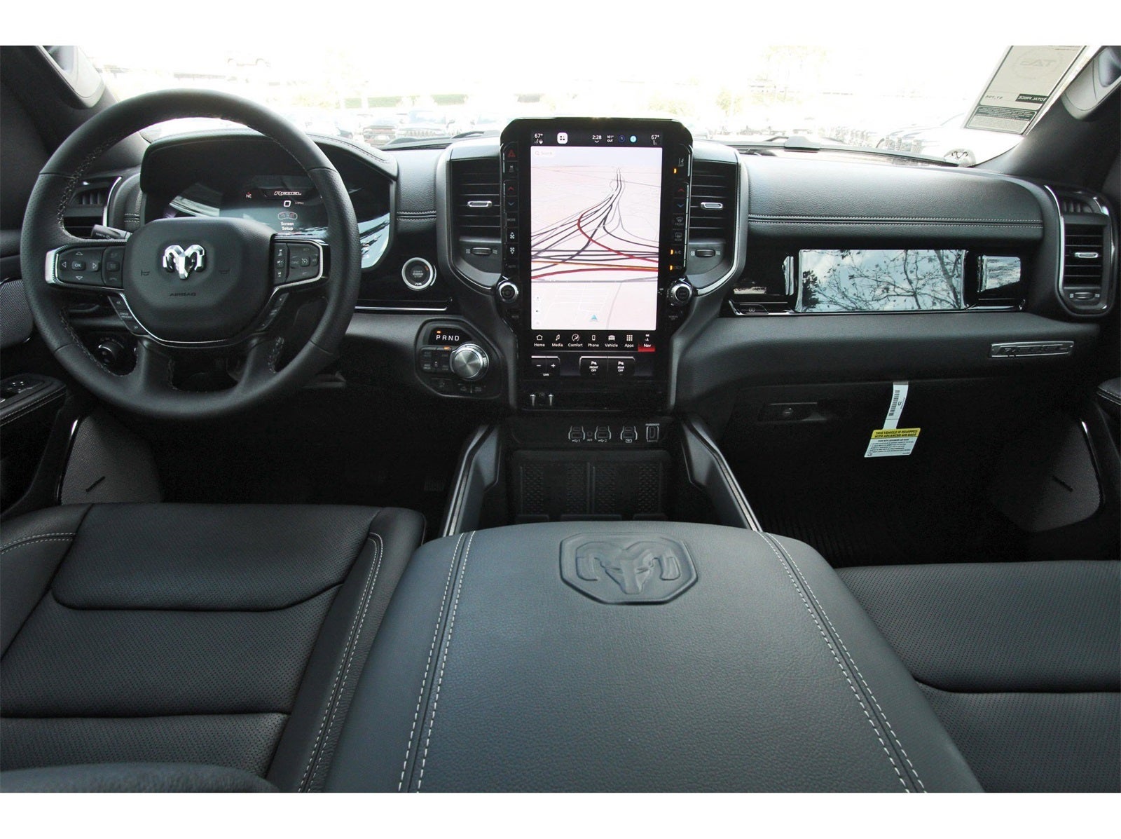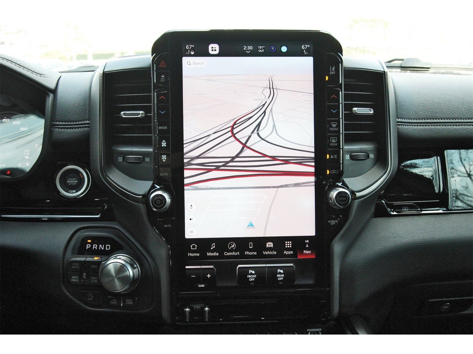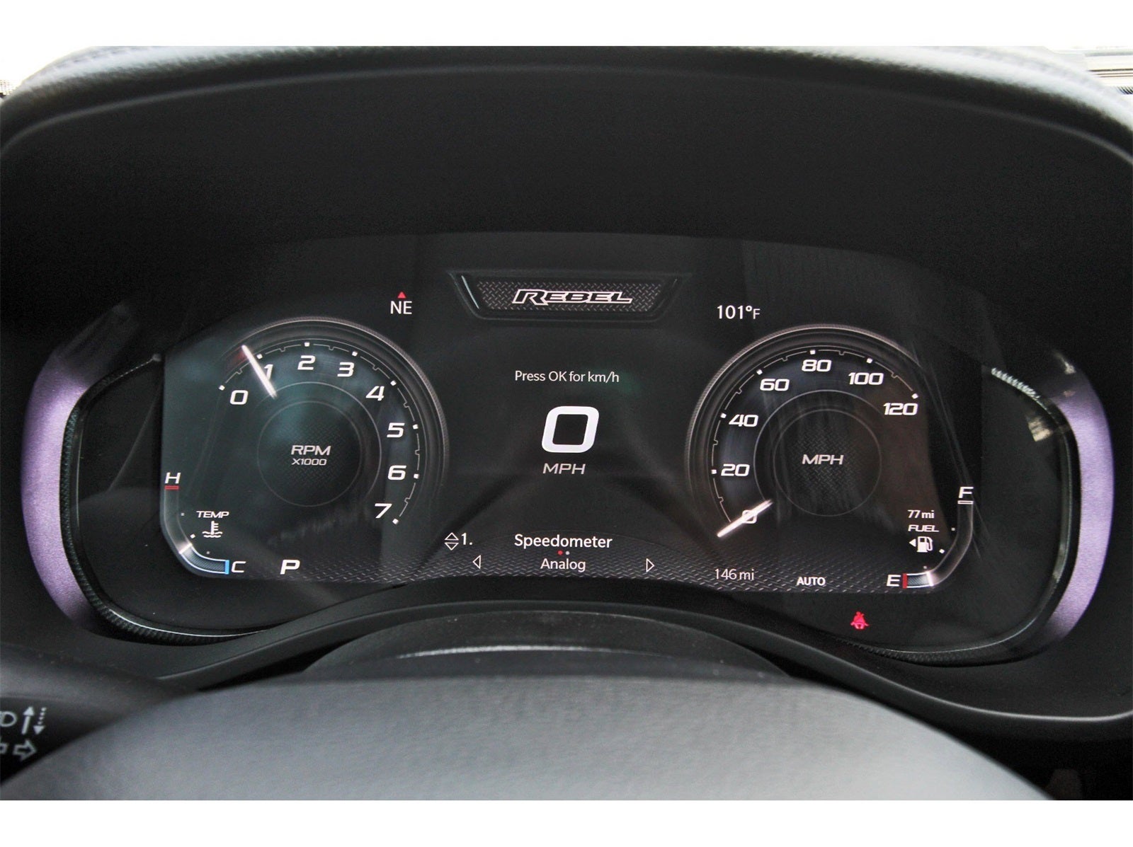 Bed Utility Group (Exterior 115V AC Outlet, MOPAR 4 Adjustable Cargo Tie-Down Hooks, and MOPAR Spray in Bedliner), Quick Order Package 21W Rebel, Rebel Level 2 Equipment Group (115V Auxiliary Rear Power Outlet, 14.4 Touchscreen Display, 2-Door Passive Entry, Front Door Locks, 4G LTE Wi-Fi Hot Spot, Accent Color Door Handles, Accent Color Premium Power Mirrors, Accent Color Tailgate Handle, Apple CarPlay, Auto Power-Folding Mirrors, Auto-Dimming Exterior Driver Mirror, Black Painted Exterior Mirrors Caps, Connected Travel and Traffic Services, Connectivity - US/Canada, Convex Wide-Angle Exterior Mirror Insert, Disassociated Touchscreen Display, Driver Seat Memory, Dual Wireless Charging Pad, Exterior Mirrors Approach Lamps, Exterior Mirrors Courtesy Lamps, Exterior Mirrors with Heating Element, Exterior Mirrors with Memory, Exterior Mirrors with Supplemental Signals, Front Passenger Interactive Display, Global Telematics Box Module, Google Android Auto, GPS Antenna Input, GPS Navigation, Harman/Kardon 19 Speaker Premium Sound, HD Radio, Heated Second Row Seats, Integrated Center Stack Radio, Integrated Voice Command with Bluetooth®, Media Hub with 2 Charge Only USBs, Off-Road Information Pages, Power 2-Way Passenger Lumbar Adjust, Power Adjust 8-Way Front Passenger Seat, Power Adjustable Pedals with Memory, Power Tailgate, Proximity Approach/Departure Lamps, Radio: Uconnect 5 Nav with 14.4 Display, Radio/Driver Seat/Mirrors/Pedals Memory, Rain Sensitive Windshield Wipers, Rear Window Defroster, Security Alarm, SiriusXM Radio Service, SiriusXM with 360L, Smartphone as a Key Capable, and USB Host Flip), 10 Speakers, 3.92 Rear Axle Ratio, 33 Gallon Fuel Tank, 4 Way Front Headrests, 4-Wheel Disc Brakes, ABS brakes, Active Noise Control System, Air Conditioning, Alloy wheels, AM/FM radio: SiriusXM with 360L, Apple CarPlay/Android Auto, Auto High-beam Headlights, Auto-dimming Rear-View mirror, Automatic temperature control, Black Exterior Mirrors, Brake assist, Bucket Seats, Cloth/Vinyl Bucket Seats, Compass, Delay-off headlights, Dome Dual LED Reading Lamp, Driver door bin, Driver vanity mirror, Dual front impact airbags, Dual front side impact airbags, Dual-Pane Panoramic Sunroof, Electronic Stability Control, Front anti-roll bar, Front Bucket Seats, Front Center Armrest w/Storage, Front dual zone A/C, Front fog lights, Front License Plate Bracket, Front reading lights, Front Seat Back Map Pockets, Front wheel independent suspension, Full Length Upgraded Floor Console, Fully automatic headlights, Garage door transmitter, Heated door mirrors, Heated Front Seats, Heated front seats, Heated Steering Wheel, Heated steering wheel, Illuminated entry, Leather steering wheel, Low tire pressure warning, Manual Folding Exterior Mirrors, MyFlexCare Service Plan, Navigation System, Occupant sensing airbag, Outside temperature display, Overhead airbag, Overhead console, Panic alarm, ParkView Rear Back-Up Camera, Passenger door bin, Passenger vanity mirror, Power 2-Way Driver Lumbar Adjust, Power Adjust 8-Way Driver Seat, Power door mirrors, Power driver seat, Power steering, Power windows, Radio data system, Radio: Uconnect 5 Navigation with 12.0 Display, Rear 60/40 Folding Seat, Rear anti-roll bar, Rear seat center armrest, Rear step bumper, Remote keyless entry, Speed control, Split folding rear seat, Steering wheel mounted audio controls, Tachometer, Telescoping steering wheel, Tilt steering wheel, Traction control, Trailer Brake Control, Trip computer, Variably intermittent wipers, Voltmeter, and Wheels: 18 x 8.0 Painted Mid-Gloss Black.