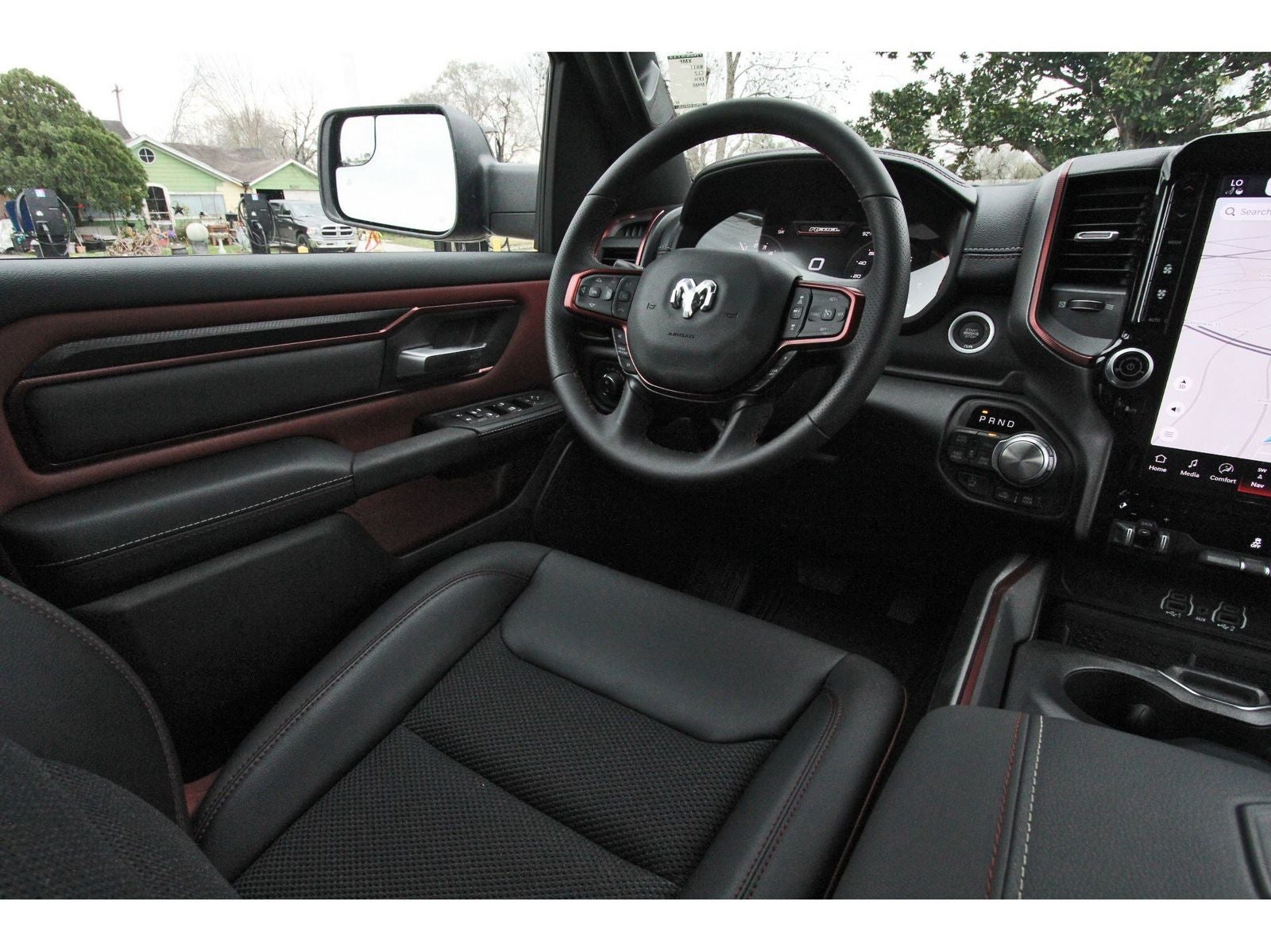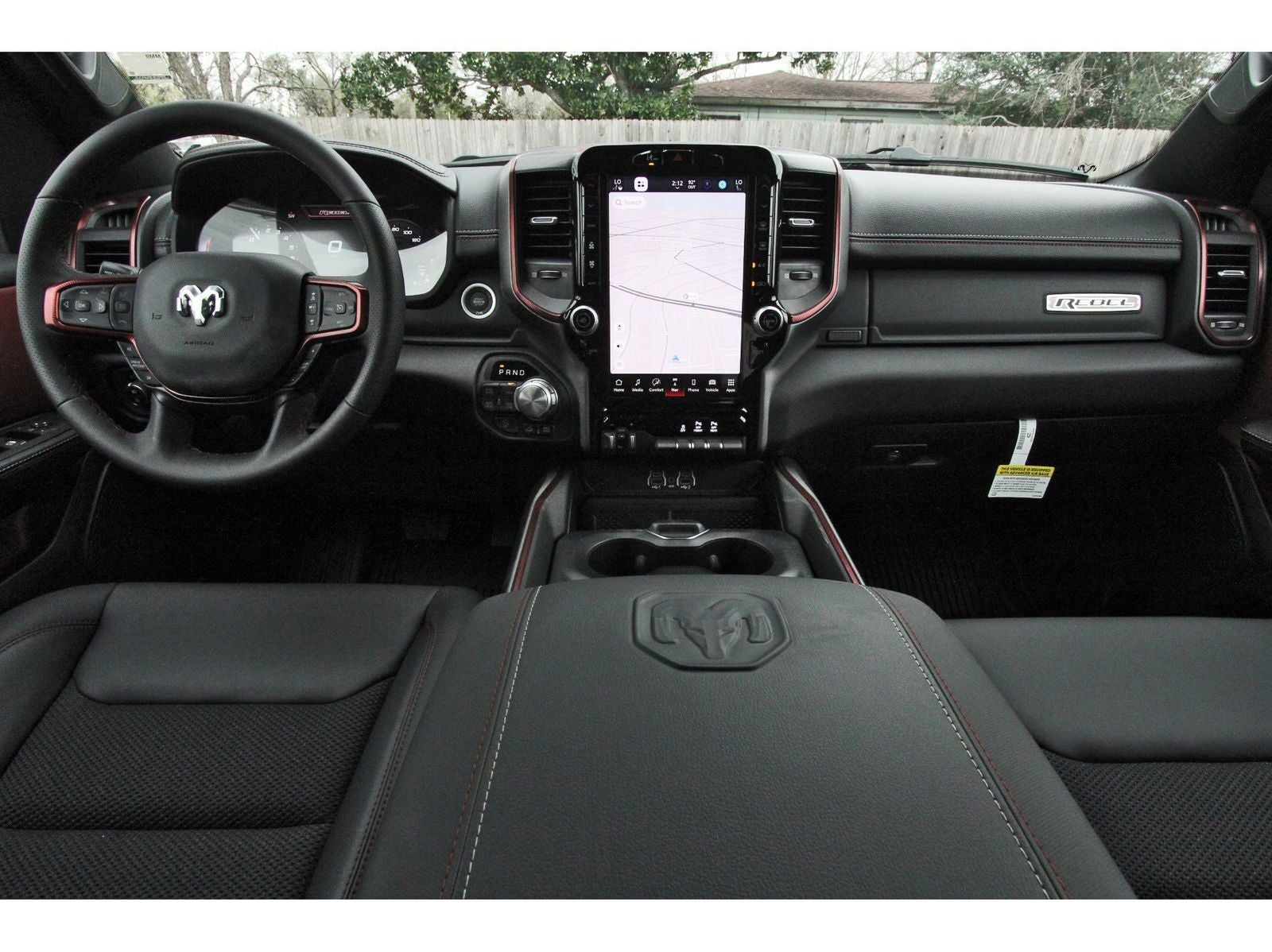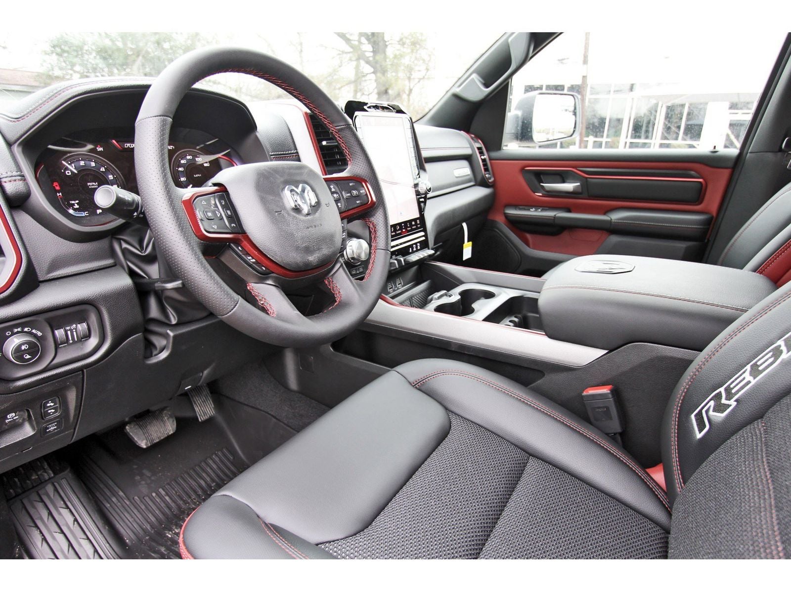Bed Utility Group (Exterior 115V AC Outlet, MOPAR 4 Adjustable Cargo Tie-Down Hooks, and MOPAR Spray in Bedliner), Quick Order Package 21W Rebel, Rebel Level 1 Equipment Group (Auto Power-Folding Mirrors, Auto-Dimming Exterior Driver Mirror, Black Exterior Mirrors, Black Premium Power Mirrors, Convex Wide-Angle Exterior Mirror Insert, Exterior Mirrors Courtesy Lamps, Exterior Mirrors with Heating Element, Exterior Mirrors with Supplemental Signals, Power Adjustable Pedals, Rear Window Defroster, Remote Tailgate Release, and Wireless Charging Pad), 10 Speakers, 3.92 Rear Axle Ratio, 4 Way Front Headrests, 4-Wheel Disc Brakes, 4G LTE Wi-Fi Hot Spot, ABS brakes, Active Noise Control System, Air Conditioning, Alloy wheels, AM/FM radio: SiriusXM with 360L, Apple CarPlay, Apple CarPlay/Android Auto, Auto High-beam Headlights, Auto-dimming Rear-View mirror, Automatic temperature control, Brake assist, Bucket Seats, Cloth/Vinyl Bucket Seats, Compass, Connected Travel and Traffic Services, Connectivity - US/Canada, Delay-off headlights, Disassociated Touchscreen Display, Driver door bin, Driver vanity mirror, Dual front impact airbags, Dual front side impact airbags, Electronic Stability Control, Front anti-roll bar, Front Bucket Seats, Front Center Armrest w/Storage, Front dual zone A/C, Front fog lights, Front License Plate Bracket, Front reading lights, Front Seat Back Map Pockets, Front wheel independent suspension, Full Length Upgraded Floor Console, Fully automatic headlights, Garage door transmitter, Global Telematics Box Module, Google Android Auto, GPS Antenna Input, GPS Navigation, HD Radio, Heated door mirrors, Heated Front Seats, Heated front seats, Heated Steering Wheel, Heated steering wheel, Illuminated entry, Integrated Center Stack Radio, Integrated Voice Command with Bluetooth®, Leather steering wheel, Low tire pressure warning, Manual Folding Exterior Mirrors, Manufacturer's Statement of Origin, Navigation System, Occupant sensing airbag, Off-Road Information Pages, Outside temperature display, Overhead airbag, Overhead console, Panic alarm, ParkView Rear Back-Up Camera, Passenger door bin, Passenger vanity mirror, Power 2-Way Driver Lumbar Adjust, Power Adjust 8-Way Driver Seat, Power door mirrors, Power driver seat, Power steering, Power windows, Radio data system, Radio: Uconnect 5 Navigation with 12.0 Display, Rear 60/40 Folding Seat, Rear anti-roll bar, Rear seat center armrest, Rear step bumper, Remote keyless entry, SiriusXM Radio Service, SiriusXM with 360L, Speed control, Split folding rear seat, Steering wheel mounted audio controls, Tachometer, Telescoping steering wheel, Tilt steering wheel, Traction control, Trailer Brake Control, Trip computer, USB Host Flip, Variably intermittent wipers, Voltmeter, and Wheels: 18 x 8.0 Painted Mid-Gloss Black.