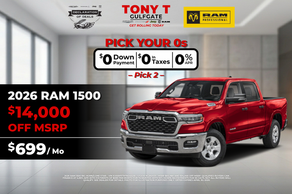 MSRP is the Manufacturer’s Suggested Retail Price and does not include tax, title, license, dealer fees, or optional equipment. Prices, offers, and incentives are subject to change without notice and may depend on eligibility and credit approval. Not all customers will qualify. Manufacturer rebates may be limited by residency restrictions; customers who do not qualify will receive a dealer discount of equal value. Financing subject to approved credit through dealer’s preferred lender. Images, pricing, and vehicle options—including color, trim, features, and availability—are subject to change and may vary from actual vehicles. Vehicles labeled as “in transit” have been built but are not yet available at the dealership. Images may not reflect exact inventory. Please contact Tony T CDJR of Gulfgate for current pricing, availability, and complete program details. Dealer is not responsible for typographical or pricing errors.