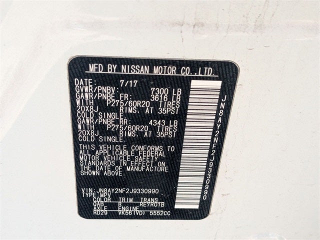 Check out all these great option's Captain Seat Package (Second Row Captain's Chairs and Second Row Center Console w/ Padded Armrest), Cargo Package, Carpeted Floor Mats w/ Captain Seat Package, 13 Speakers, 2.937 Axle Ratio, 3rd row seats: split-bench, 4-Wheel Disc Brakes, A/V remote, ABS brakes, Air Conditioning, Alloy wheels, AM/FM radio: SiriusXM, Anti-whiplash front head restraints, Auto tilt-away steering wheel, Auto-dimming door mirrors, Auto-dimming Rear-View mirror, Auto-leveling suspension, Automatic temperature control, Brake assist, Bumpers: body-color, CD player, Delay-off headlights, Driver door bin, Driver vanity mirror, Dual front impact airbags, Dual front side impact airbags, Electronic Stability Control, Emergency communication system: NissanConnect Services, Four wheel independent suspension, Front anti-roll bar, Front Bucket Seats, Front Center Armrest, Front dual zone A/C, Front fog lights, Front reading lights, Fully automatic headlights, Garage door transmitter: HomeLink, Headphones, Heated & Cooled Front Bucket Seats w/Driver Memory, Heated door mirrors, Heated front seats, Heated rear seats, Heated steering wheel, Illuminated entry, Lane Departure Warning System, Leather Shift Knob, Leather-Appointed Seat Trim, Low tire pressure warning, Memory seat, Navigation System, Occupant sensing airbag, Outside temperature display, Overhead airbag, Overhead console, Panic alarm, Passenger door bin, Passenger vanity mirror, Power door mirrors, Power driver seat, Power Liftgate, Power moonroof, Power passenger seat, Power steering, Power windows, Radio data system, Radio: Bose AM/FM/SXM/CD/MP3/HD Radio, Rain sensing wipers, Rear air conditioning, Rear anti-roll bar, Rear reading lights, Rear seat center armrest, Rear window defroster, Rear window wiper, Reclining 3rd row seat, Remote keyless entry, Roof rack: rails only, Roof Rail Cross Bars, Security system, Speed control, Speed-sensing steering, Speed-Sensitive Wipers, Split folding rear seat, Spoiler, Steering wheel memory, Steering wheel mounted audio controls, Tachometer, Telescoping steering wheel, Tilt steering wheel, Traction control, Trip computer, Turn signal indicator mirrors, Variably intermittent wipers, Ventilated front seats, Voltmeter, and Wheels: 20 Machine-Faced Chrome w/Tinted CC Get Rolling Today!!! Come see us today!!! Family owned and operated!!! We also ship!!! Visit us at 2801 St Matthews Rd Orangeburg SC 29118 or www.tonytcdjr.com 803-534-5251.